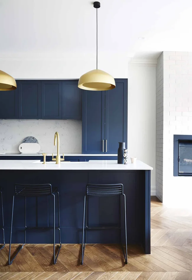 In this revamped weatherboard cottage in Daylesford, soft navy blue kitchen cabinets add a rich pop of colour to the industrial chic-inspired space. Painted in Dulux’s Ticking, the cabinets work well with the white subway tile splashback, stainless steel appliances and sleek concrete benchtops.