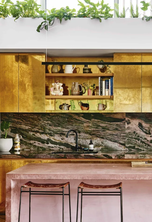 It’s go big or go home in this Pinterest-worthy kitchen from Kip & Co co-founder Alex McCabe’s former weatherboard home. A dusty pink island bench meets a crocodile bamboo quartzite splashback and glamorous gold cabinetry, culminating in an ultra-luxe feel.
