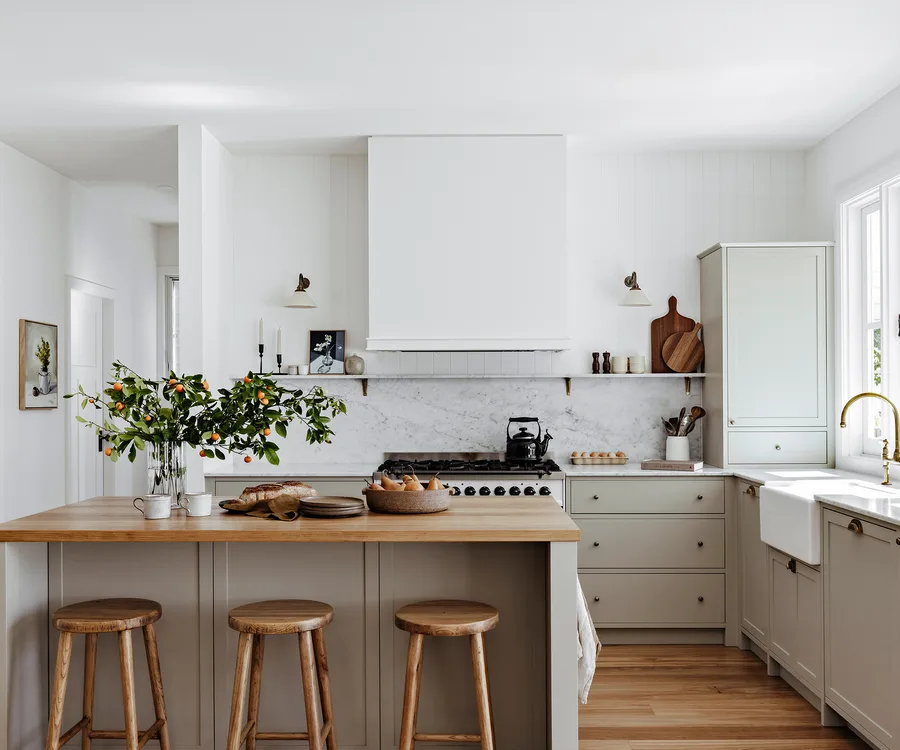 The kitchen also features joinery handpainted in Dulux Oyster Linen, marble benchtops, integrated appliances, a generous timber-topped island bench and a butler’s pantry with a second sink and generous storage. It’s a light, bright and welcoming space with warm materials and textured layers that are repeated in the other rooms.