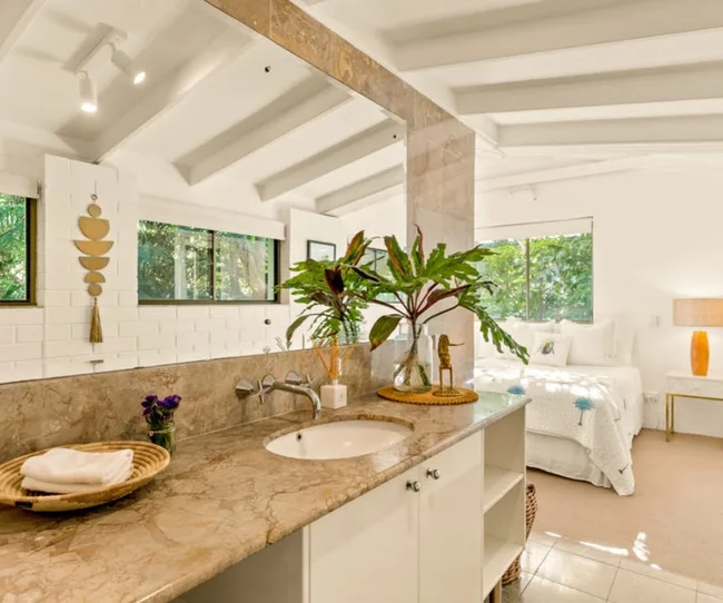Formerly a popular rental property, ‘Larimar @ Wategos’ is a five-bedroom, three-bathroom beach house right on the doorstep of both the beach and popular restaurant, Raes. Knock down a wall between it and the neighbouring duplex and Lesleigh and Chris could now be looking at a eight-bedroom, five-bathroom home in one of Byron’s most prestigious and private enclaves.
