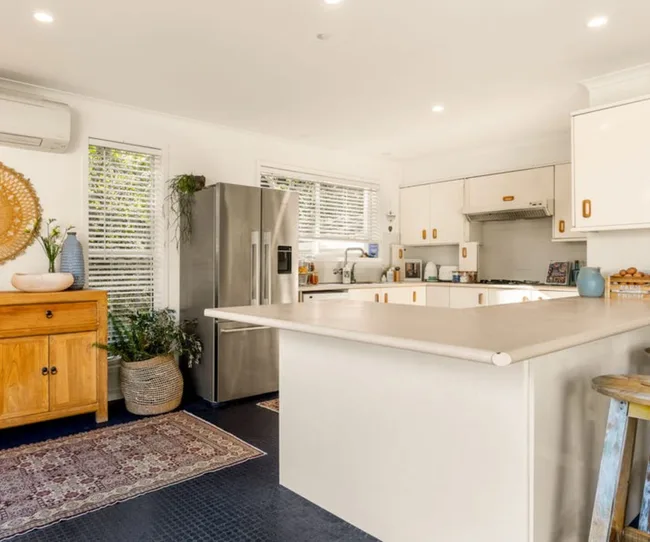 The kitchen — although slightly dated — has good bones, being positioned in an open-plan living space that is bathed in light thanks to the expansive deck right outside.