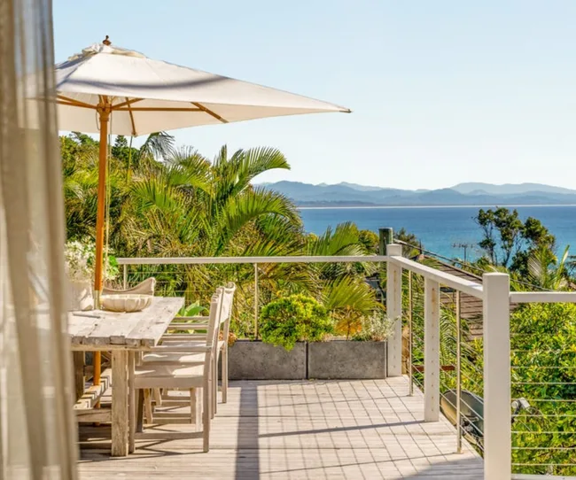 Set up on the hillside, the deck overlooks Byron Bay’s popular Wategos beach.