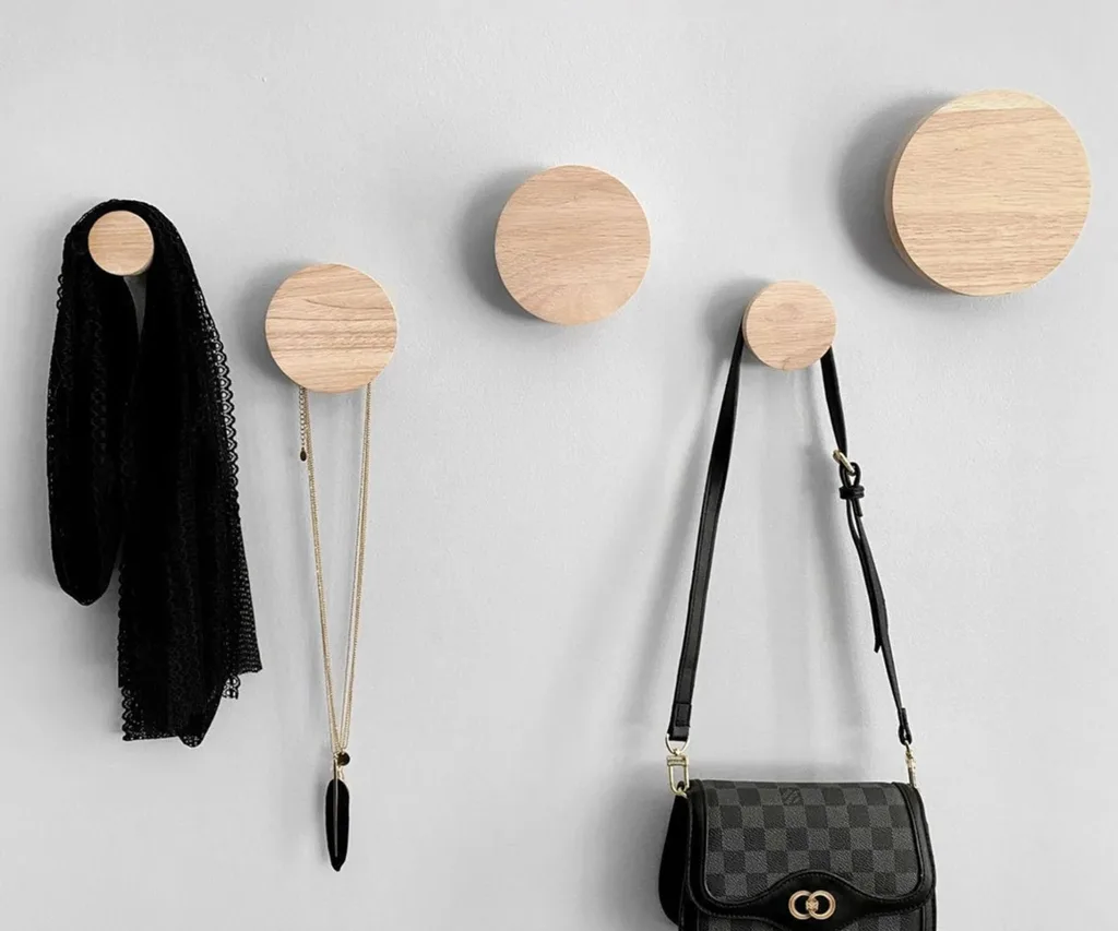 Round oak wooden wall hooks, $24.95, Etsy