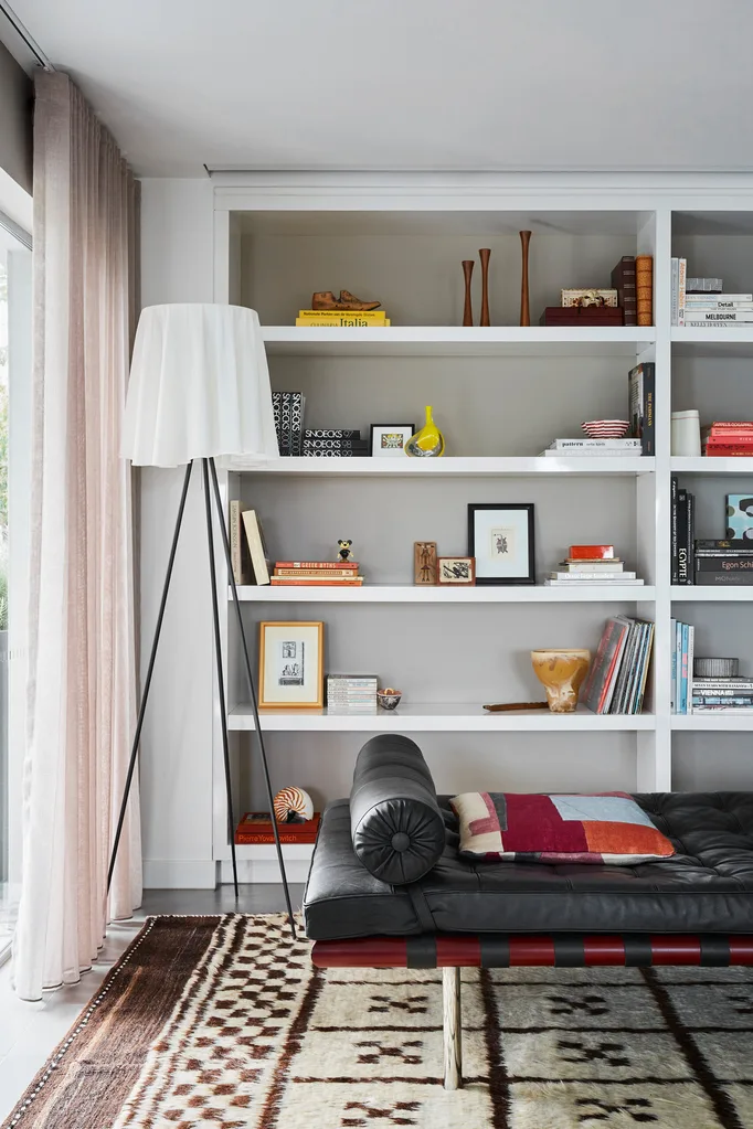 Expect the unexpected! Ruth’s home is contemporary, filled with modern Scandi furniture. An element of surprise is important in creating visual interest, achieved by Ruth’s bright use of colour and vintage pieces like the Ludwig Mies van der Rohe day bed in the library.