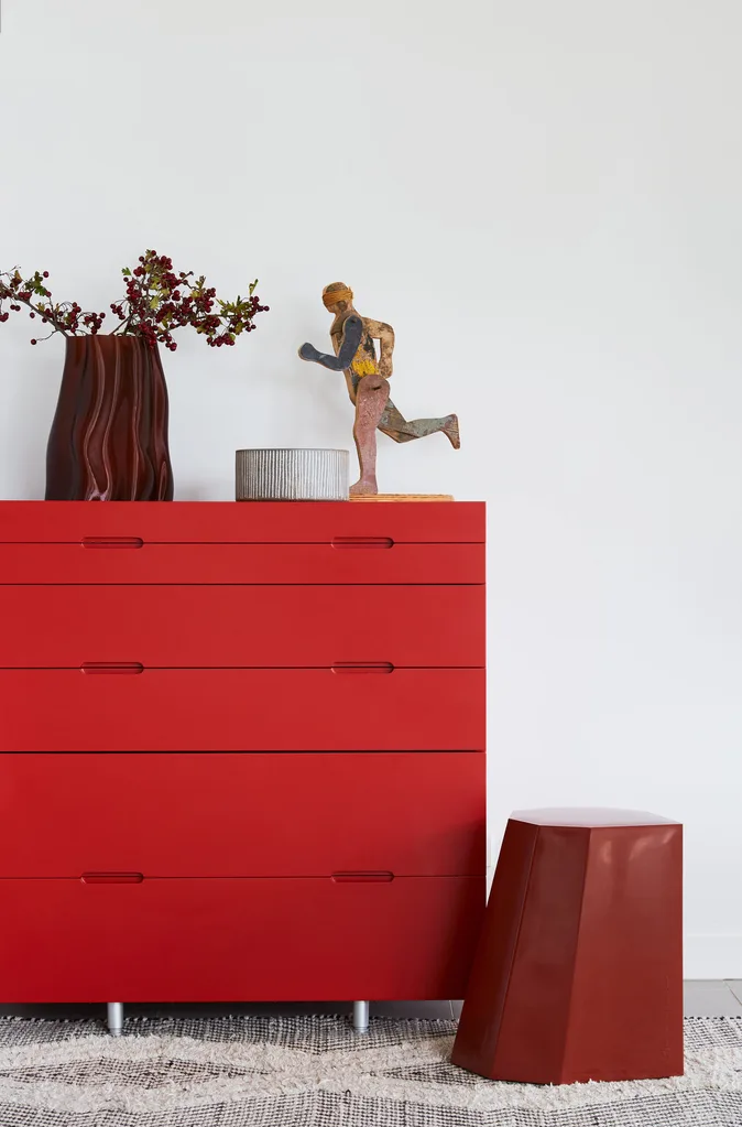 The Molteni&C chest of drawers is loud and proud with colour, so Ruth complemented it with the Special Studio ‘Lulu’ waste bin in Burnt Amber, while Dulux White On White creates contrast. The sculpture by Robert Delves proves that art doesn’t have to be hung on walls — it has a place atop counters as well.