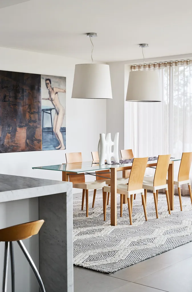 A painting by Belgian artist Hans Bruyneel takes centre stage in this understated beauty of a dining room. Calacatta Belgia marble, supplied by CDK Stone, creates a touch of drama with the natural veining on the kitchen island. The Miller Rhythm Chime Bone rug unites the ‘Extensia’ dining table by Ligne Roset and the ‘Miss Trip’ dining chairs by Philippe Starck for Kartell.