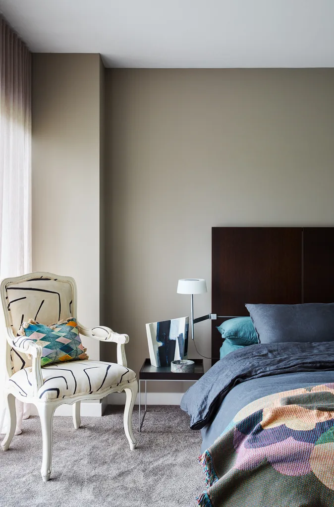 Just because you’ve used a bold colour doesn’t mean you aren’t able to draw inspiration from the rest of the rainbow. The base of Ruth’s palette was filled with whites, greys and beige, so she created energy with the use of a bright red. In the bedroom, she contrasted this choice with serene blues. Don’t be afraid to mix it up.