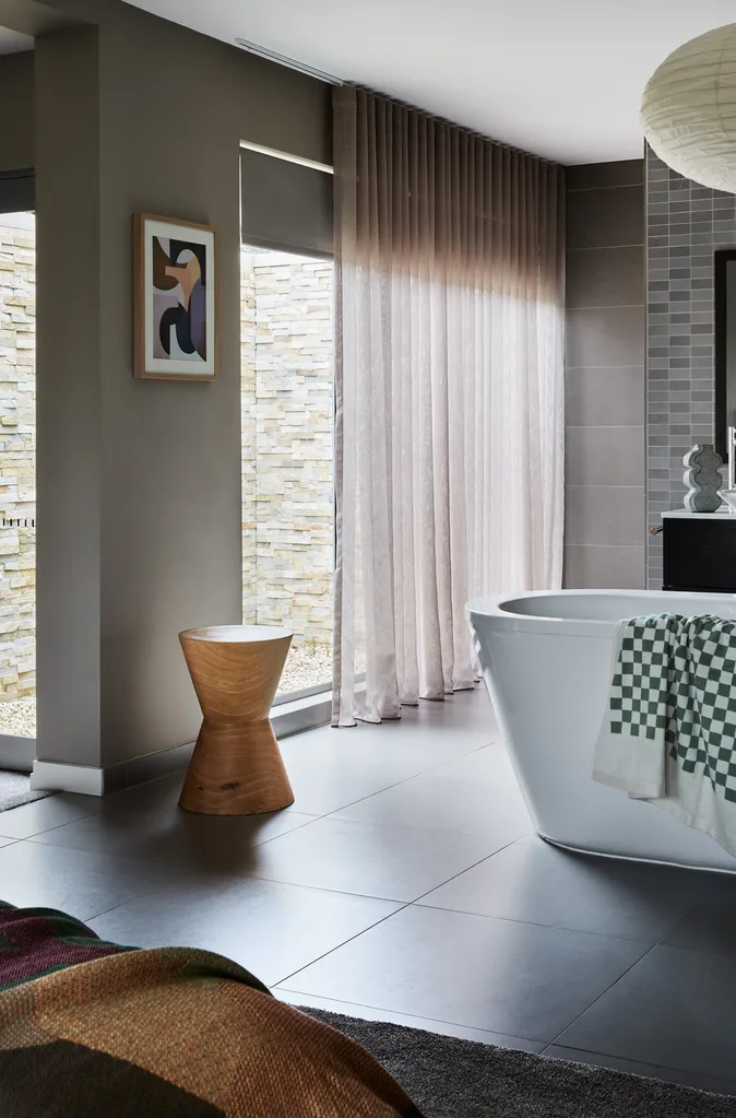 This ensuite is as airy and spacious as they come, making the most of the open-plan design which sees it stretch out from the main bedroom, unencumbered by walls. ‘Dampier’ pendant from The Society inc. draws the eye up while the Berit Mogensen Lopez art print, from Designstuff, introduces colour to the room on a smaller and more fitting scale. Walls are painted in Dune by Dulux. The Emily Ellis vase on the vanity is from pépite.