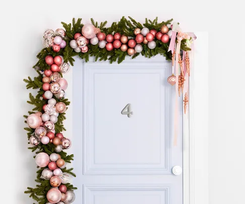 5 Embellish garland with ornaments on ribbons, hung at varying heights for extra visual impact.