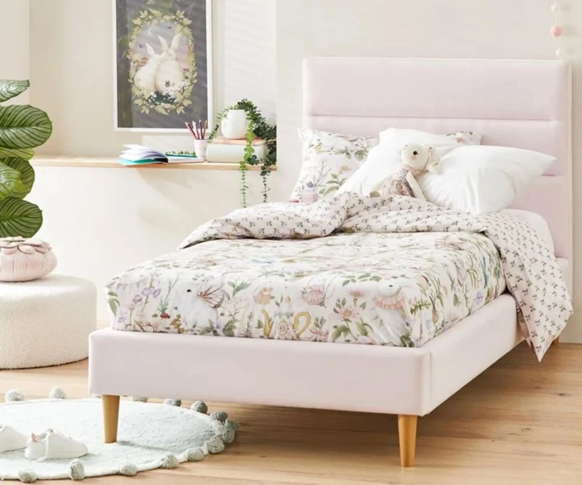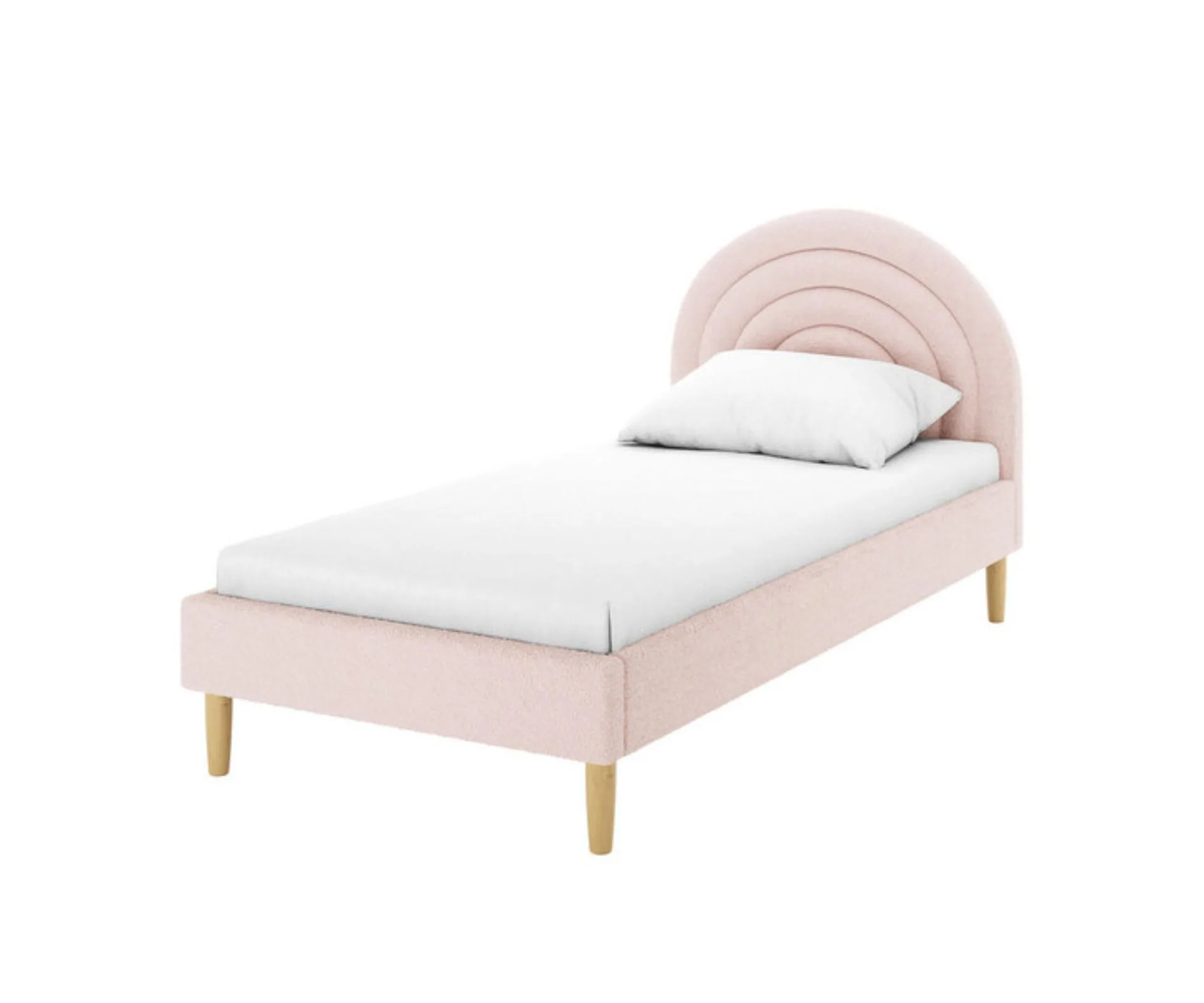 Have you seen anything sweeter than this soft pink boucle rainbow bedframe? It looks like it’s being cuddled by clouds, and it has been designed with your little one in mind — with a low base, sturdy timber construction, and a soft, padded boucle finish.