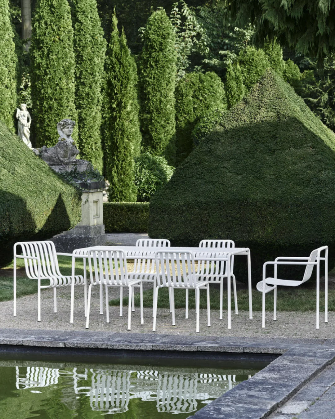 The Palissade Outdoor Collection by Hay was designed in 2014 and reimagines metal furniture for contemporary outdoor living. Characterised by slender, rounded slats and modular forms, the pieces amalgamates durability with versatility. Their simple, considered proportions make the collection adaptable to a range of environments.