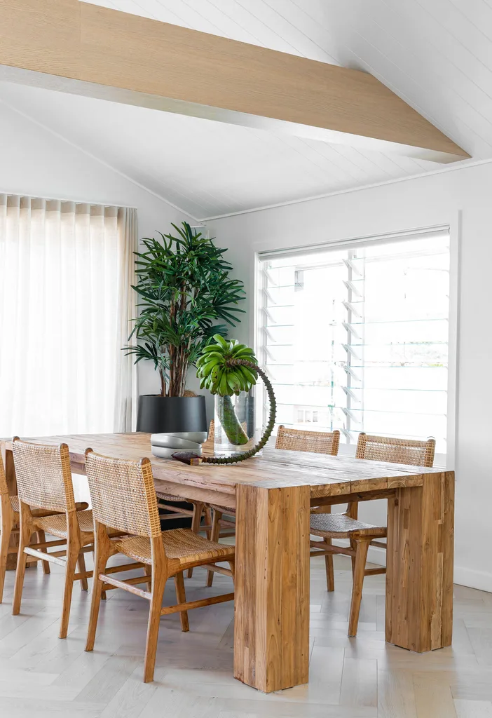 Homeowner and director of Balgowlah-based residential design studio Your Beautiful Home, Anna Williams, paired the timber dining table in her coastal style home with Nalani rattan chairs from Inartisan.