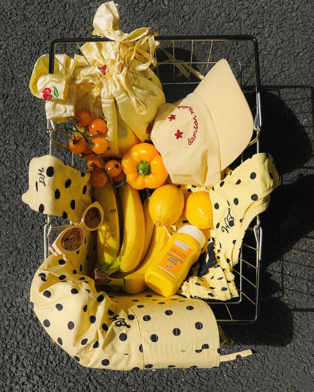 Recently, Jacquemus launched the “Le Valérie” handbag with an immersive activation that alchemised the Paris and New York stores into markets, where the latest bag launch was displayed against crates of seasonal produce – oranges, lemons, onions – and immaculately folded attire and accessories. The activation could be seen from the storefront, where a white scalloped awning added to the organic styling ideas. This is not the first time we have seen seasonal produce styled by the masters of marketing. Earlier this year, the Jacquemus team launched a new collection of emblems and accessories, and advertised it by having children dress up as said charms in the spirit of Halloween. Or, when the French brand tapped White Lotus actor Jon Gries for a campaign that saw the actor reclining on a banana-yellow car and driving around a cart full of bananas.