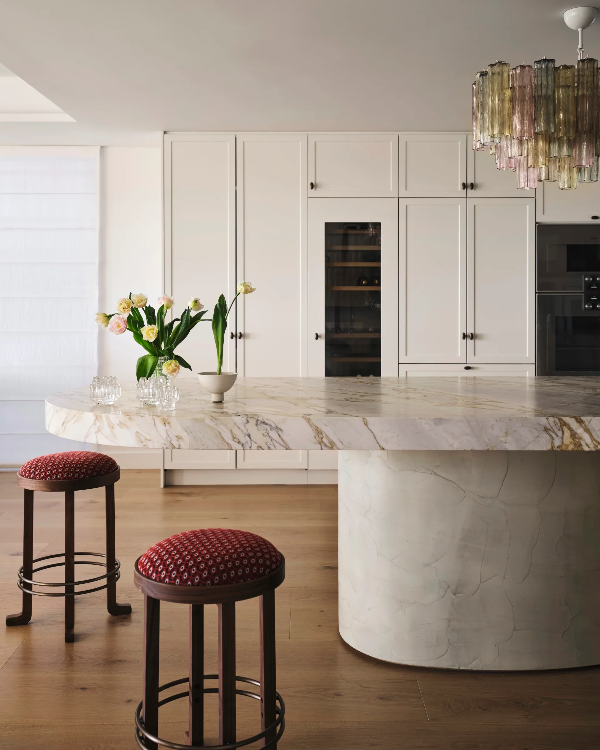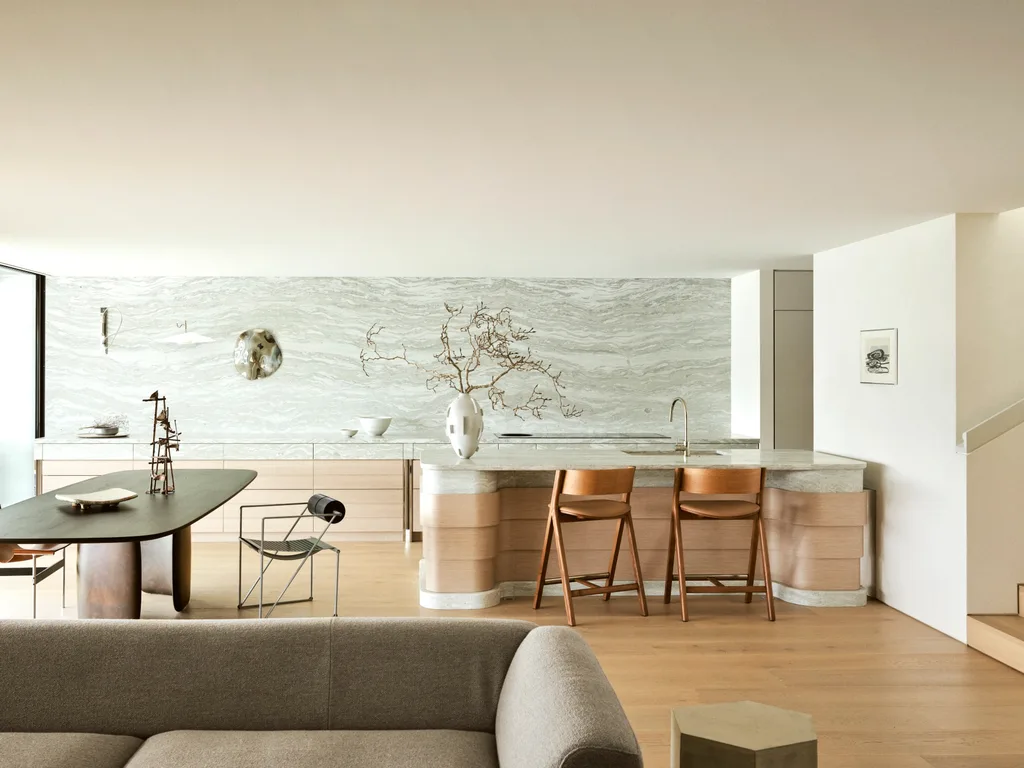This kitchen takes centre stage at a glamourous penthouse remodel by Smac Studio in Sydney’s Milson Point. A seven-meter kitchen island with a curved microcement base, topped with a beautiful marble with veins of bronze and cream, is commanding but not overpowering.